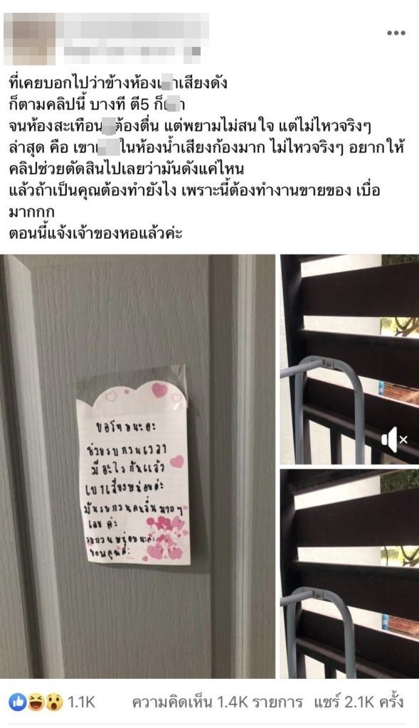 โดยล่าสุดสมาชิกเฟซบุ๊กรายหนึ่งอดรนทนไม่ไหว ต้องนำคลิปมาให้ชาวเน็ตช่วยตัดสินว่า เสียงรบกวนของข้างห้องนั้นมันดังแค่ไหน และสมควรหรือไม่ที่เธอจะต้องแปะกระดาษโน้ตเตือน รวมทั้งไปแจ้งเจ้าของหอให้รับทราบปัญหา