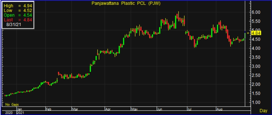 ผู้สื่อข่าวรายงานว่า ราคาหุ้น บริษัท ปัญจวัฒนาพลาสติก จำกัด (มหาชน) หรือ PJW ณ เวลา 14.42 น. อยู่ที่ระดับ 4.84 บาท บวก 0.34 บาท หรือ 7.56% สูงสุดที่ระดับ 4.94 บาท ต่ำสุดที่ระดับ 4.52 บาท ด้วยมูลค่าการซื้อขาย 95.73 ล้านบาท