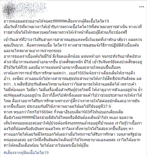 ผู้ใช้เฟซบุ๊กรายหนึ่งที่ติดโควิด 19 โพสต์เล่าเรื่องราวปัญหาของตัวเองขณะทำการรักษาความว่า ยาวหน่อยแต่ช่วยอ่านให้จบค่ะ!!!!!!!!!! #เสียงจากผู้ติดเชื้อโควิด19