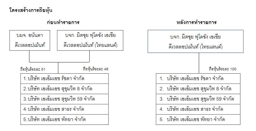 ซึ่งบริษัทถือหุ้นในสัดส่วนร้อยละ 51 ของทุนจดทะเบียนของแต่ละบริษัท คิดเป็นจำนวนเงินรวมทั้งสิ้น 2,540 ล้านบาท ให้กับบริษัท มิตซุย ฟุโดซัง เอเชีย ดีเวลลอปเม้นท์ (ไทยแลนด์) จำกัด (MFADT) ซึ่งไม่เป็นบุคคลที่เกี่ยวโยงกันของบริษัท โดยบริษัทย่อยทั้ง 5 บริษัทดังกล่าวดำเนินธุรกิจพัฒนาโครงการเซอร์วิส อพาร์ทเม้นท์