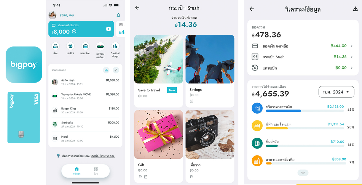 การเปิดตัว BigPay ในประเทศไทย เริ่มจากฟังก์ชันกระเป๋าเงินดิจิทัลหรือ “อี-วอลเล็ต” ที่มีฟีเจอร์พิเศษคือ “Stash” ช่วยในการเก็บออมเงิน เพราะฟีเจอร์นี้ทำให้ผู้ใช้สามารถสร้างกระเป๋าย่อยเพื่อวางเป้าหมายการเก็บออมต่างๆ ได้ภายในแอปฯ เช่น ทริปท่องเที่ยว ซื้อของขวัญ