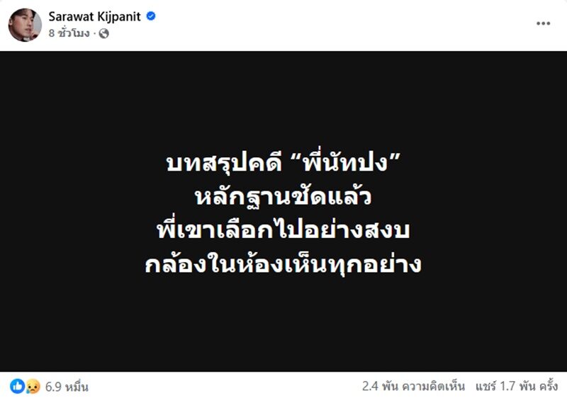 ขณะที่ไอซ์ สารวัตร ก็โพสต์ข้อความชัดเจนถึงคดี นัทปง ด้วยเช่นกันว่า “บทสรุปคดี “พี่นัทปง” หลักฐานชัดแล้ว พี่เขาเลือกไปอย่างสงบ กล้องในห้องเห็นทุกอย่าง”