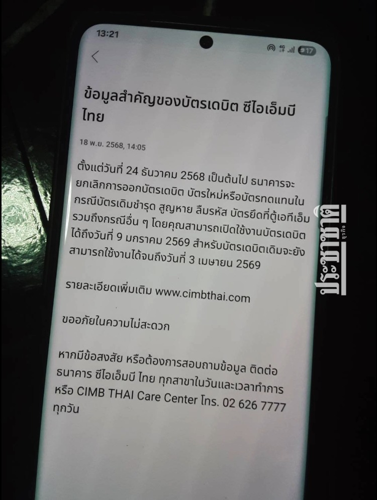 ผู้สื่อข่าวรายงานว่า ธนาคารซีไอเอ็มบี ไทย (CIMB THAI) แจ้งลูกค้าผ่านแอปพลิเคชั่น CIMB THAI เมื่อวันที่ 18 พฤศจิกายน 2568 เกี่ยวกับการให้บริการบัตรเดบิต โดยระบุว่า “ตั้งแต่วันที่ 24 ธันวาคม 2568 เป็นต้นไป ธนาคารจะยกเลิกการออกบัตรเดบิต บัตรใหม่หรือบัตรทดแทนในกรณีบัตรเดิมชำรุด สูญหาย ลืมรหัส บัตรยึดที่ตู้เอทีเอ็ม รวมถึงกรณีอื่น ๆ โดยสามารถเปิดใช้งานบัตรเดบิตได้ถึงวันที่ 9 มกราคม 2569 สำหรับบัตรเดบิตเดิมจะยังสามารถใช้งานได้จนถึงวันที่ 3 เมษายน 2569”