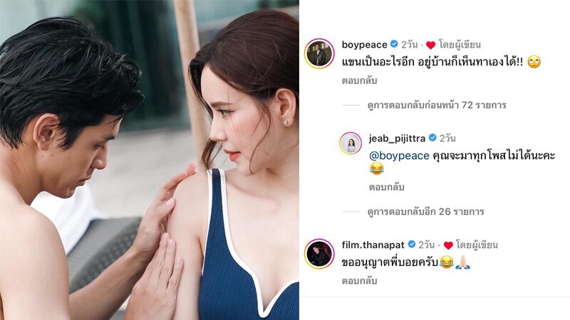 งานนี้สาวเจี๊ยบก็ตอบกลับคอมเมนต์ แซวกลับว่า"คุณจะมาทุกโพสต์ไม่ได้นะคะ" แถมมิวาย หนุ่มฟิล์ม ก็รีบมาคอมเมนต์ทันทีว่า"ขออนุญาตพี่บอยครับ" พร้อมอิโมจิหัวเราะน้ำตาไหล และ พนมมือ