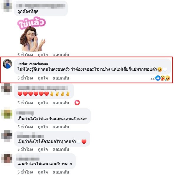 ด้าน เรดาร์ ปรชญา น้องสาวคนเล็ก ก็เข้ามาคอมเมนต์ด้วยว่า “ไม่มีใครรู้ดีเท่าคนในครอบครัว ว่าต้องเจออะไรมาบ้าง แค่แม่เสียก็แย่มากพอแล้ว” ท่ามกลางคอมเมนต์เข้ามาให้กำลังใจจำนวนมาก