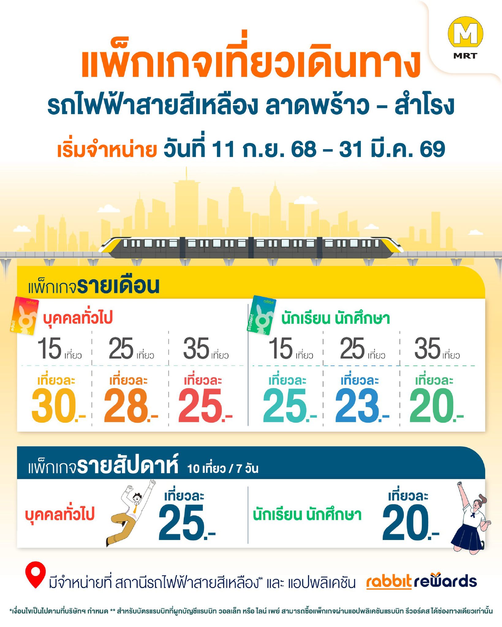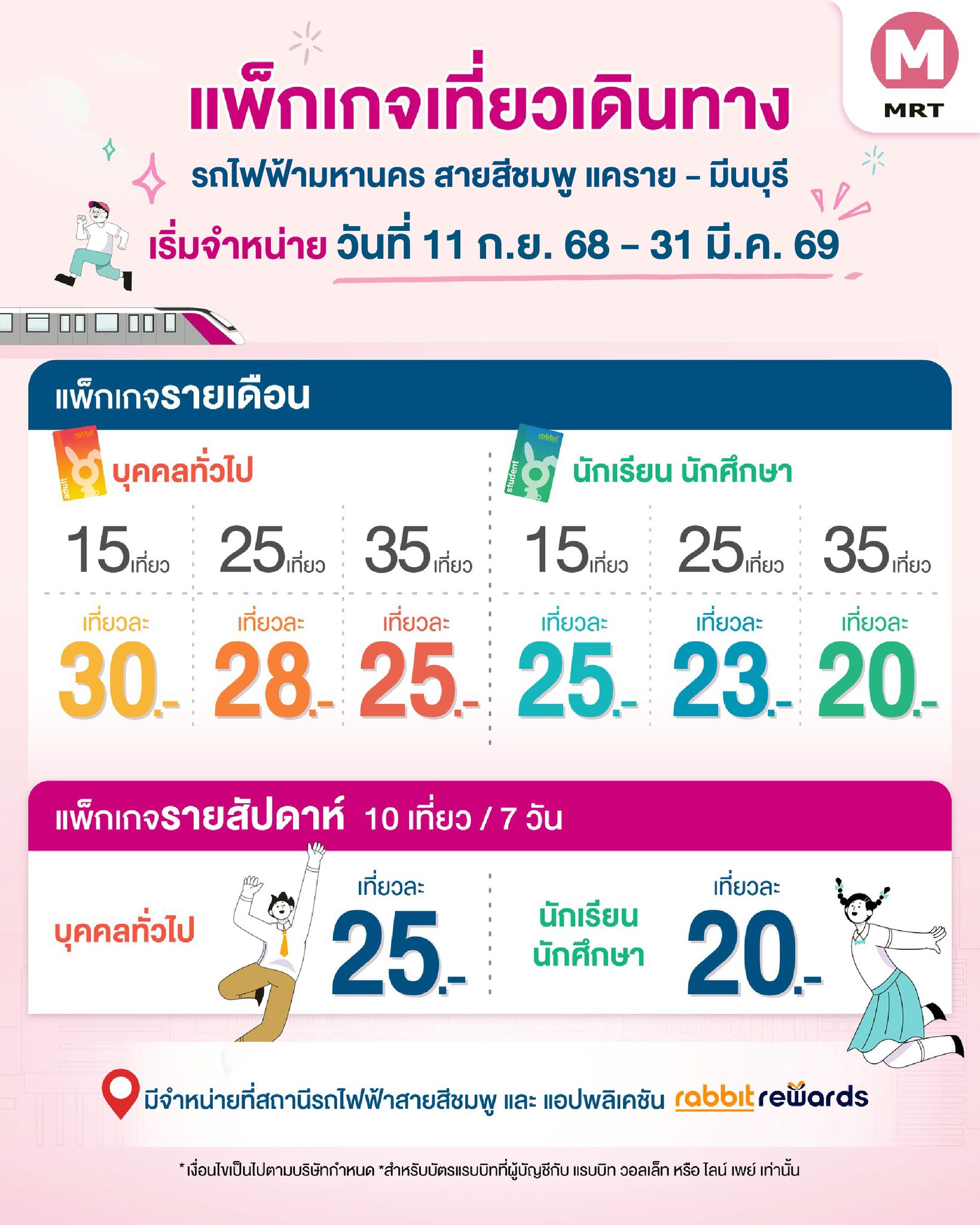 ขณะเดียวกัน รถไฟฟ้า MRT สายสีเหลือง และ MRT สายสีชมพู ประกาศกลับมาจำหน่ายแพ็กเกจเที่ยวเดินทางเช่นกัน ทั้งแบบรายสัปดาห์ 10 เที่ยว/7 วัน และรายเดือน 15/25/35 เที่ยว/30 วัน จำหน่ายผ่านห้องจำหน่ายบัตรโดยสาร บนสถานีรถไฟฟ้ามหานคร สายสีเหลือง ทั้ง 23 สถานี บนสถานีรถไฟฟ้ามหานคร สายสีชมพู ทั้ง 30 สถานี และสายเมืองทองธานี 2 สถานี หรือซื้อผ่านแอปพลิเคชั่นแรบบิท รีวอร์ดส ตั้งแต่วันที่ 11 กันยายน 2568-31 มีนาคม 2569