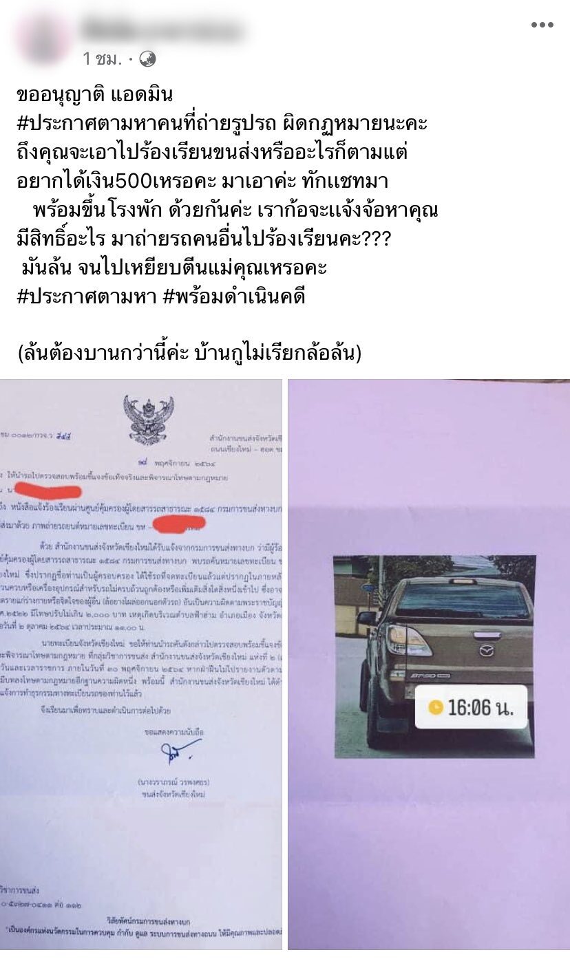 โดยหญิงสาวโพสต์ข้อความตามหาคนที่ถ่ายรูปรถของตัวเองไปร้องเรียน ระบุว่า " #ประกาศตามหาคนที่ถ่ายรูปรถ ผิดกฎหมายนะคะ ถึงคุณจะเอาไปร้องเรียนขนส่งหรืออะไรก็ตามแต่ อยากได้เงิน 500 เหรอคะ มาเอาค่ะ ทักแชทมา พร้อมขึ้นโรงพักด้วยกัน เราก็จะแจ้งข้อหาคุณ มีสิทธิ์อะไร มาถ่ายรถคนอื่นไปร้องเรียนคะ? มันล้น จนไปเหยียบตีนแม่คุณเหรอ #ประกาศตามหา #พร้อมดำเนินคดี (ล้นต้องบานกว่านี้ค่ะ บ้านกูไม่เรียกล้อล้น)"