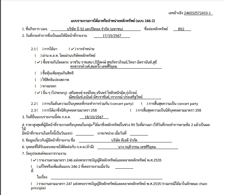 ผู้สื่อข่าวรายงานว่า สำนักงานคณะกรรมการกำกับหลักทรัพย์และตลาดหลักทรัพย์ (ก.ล.ต) แจ้งในแบบรายงานการได้มาหรือหน่อยหลักทรัพย์ (แบบ 246-2) ในวันที่ 18 ต.ค.67 ว่า บริษัท ทีเจดี จำกัด ผู้ถือหุ้นรายใหญ่อันดับ 2 เทขายหุ้น บริษัท บี-52 แคปปิตอล จำกัด (มหาชน) หรือ B52 ออกมาจำนวน 77,632,500 หุ้น คิดเป็นสัดส่วน 10.5286% ของสิทธิออกเสียงทั้งหมดของกิจการ โดยภายหลังการขายหุ้นดังกล่าว บริษัท ทีเจดี จำกัด ไม่เหลือการถือหุ้นใน B52