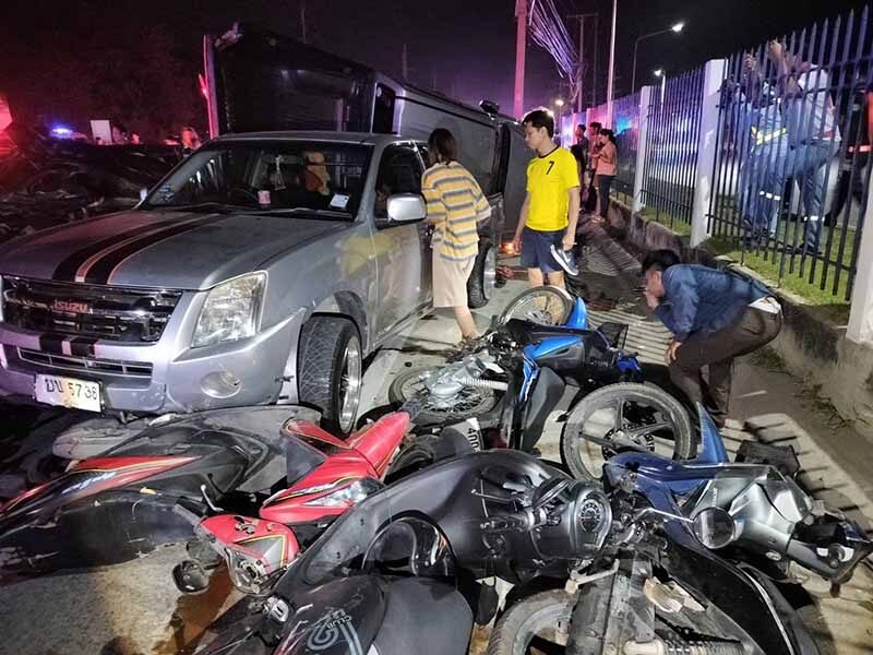 กระบะซิ่งแข่งกันมา เสียหลักพุ่งชนรถจอดข้างทาง พังระเนระนาด 10 คันรวด เจ็บ 6