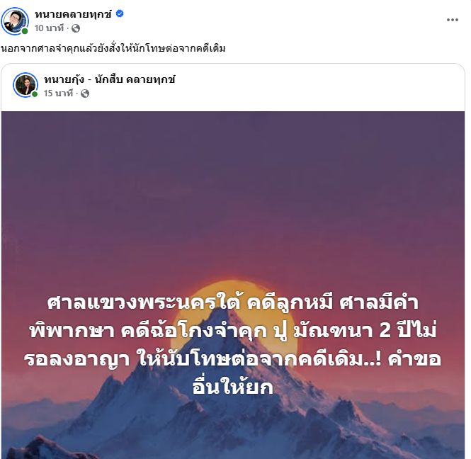 ด้านเพจ ทนายคลายทุกข์ โพสต์ด้วยว่า "#ข่าวด่วน ศาลแขวงพระนครใต้พิพากษา จำคุกปูมัณฑนา ข้อหาฉ้อโกง 2 ปีไม่รอลงอาญา"
