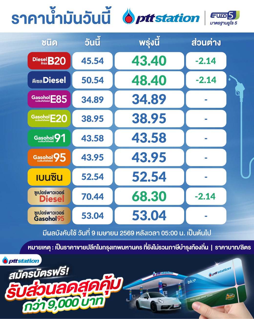 ราคาน้ำมันพรุ่งนี้ (9 เม.ย. 2569) ปั๊มน้ำมันประกาศปรับราคาดีเซล ลดลง 2.14 บาท เบนซิน-แก๊สโซฮอล์ทุกชนิด คงเดิม มีผลตั้งแต่ตี 5 เป็นต้นไป
