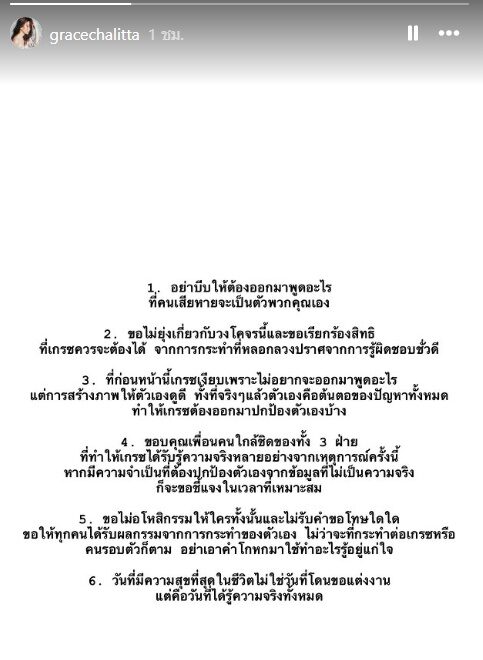- ขอบคุณเพื่อนคนใกล้ชิดของทั้ง 3 ฝ่าย ที่ทำให้เกรซได้รับรู้ความจริงหลายอย่าง จากเหตุการณ์ครั้งนี้ หากมีความจำเป็นที่ต้องปกป้องตัวเองจากข้อมูลที่ไม่เป็นความจริง ก็จะขอชี้แจงในเวลาที่เหมาะสม