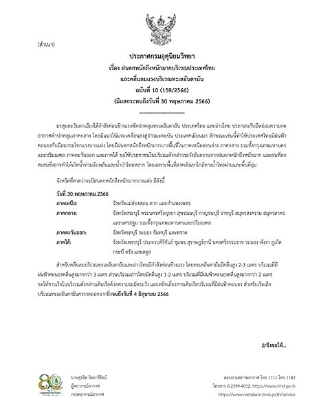 วันที่ 30 พ.ค.2566 กรมอุตุนิยมวิทยา ประกาศ เรื่อง ฝนตกหนักถึงหนักมากบริเวณประเทศไทย และคลื่นลมแรงบริเวณทะเลอันดามัน ฉบับที่ 10 (159/2566) (มีผลกระทบถึงวันที่ 30 พฤษภาคม 2566) ระบุว่า มรสมตะวันตกเฉียงใต้กำลังค่อนข้างแรงพัดปกคลุมทะเลอันดามัน ประเทศไทย และอ่าวไทย ประกอบกับมีหย่อมความกดอากาศต่ำปกคลุมภาคกลาง โดยมีแนวโน้มจะเคลื่อนลงสู่อ่าวมะตะบัน ประเทศเมียนมา