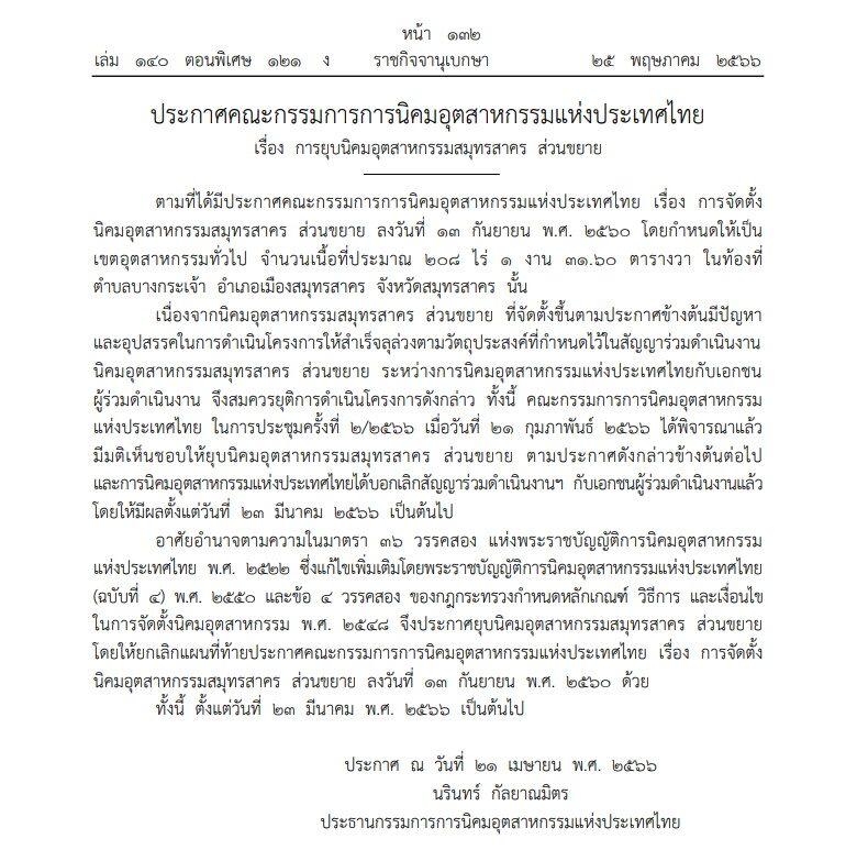 เมื่อวันที่ 26 พ.ค.66 เว็บไซต์ราชกิจจานุเบกษา เผยแพร่ ประกาศคณะกรรมการการนิคมอุตสาหกรรมแห่งประเทศไทย เรื่อง การยุบนิคมอุตสาหกรรมสมุทรสาคร ส่วนขยาย ลงนามโดยนายนรินทร์ กัลยาณมิตร ประธานกรรมการการนิคมอุตสาหกรรมแห่งประเทศไทย (กนอ.)