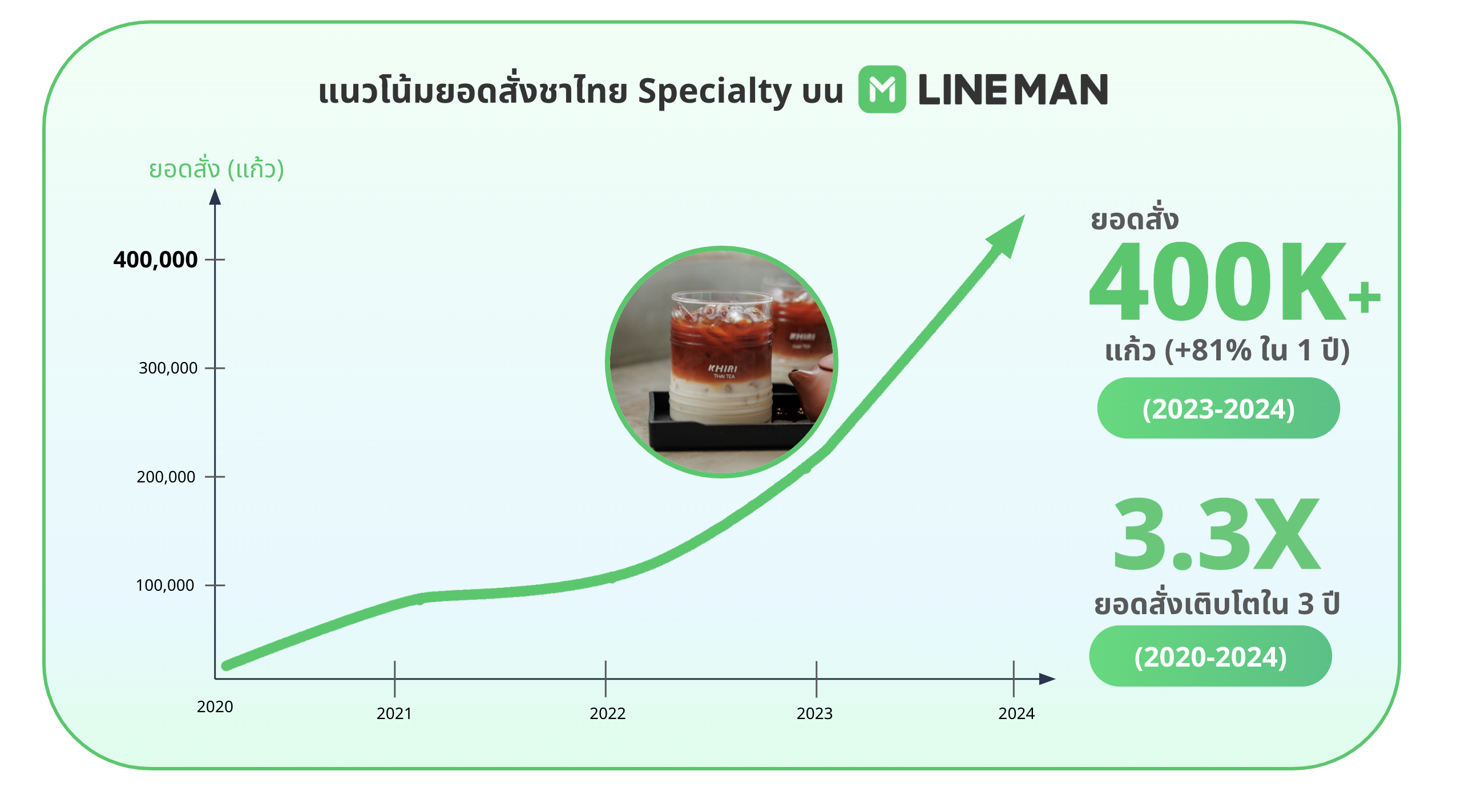 และหากรวมสถิติตั้งแต่ปี 2563 - 2567 พบว่า คนไทยสั่งชาไทย โต 3.3 เท่าตัว หรือประมาณ 330% สูงกว่ากาแฟ Specialty ที่เติบโต 2.7 เท่าตัว หรือประมาณ 270%