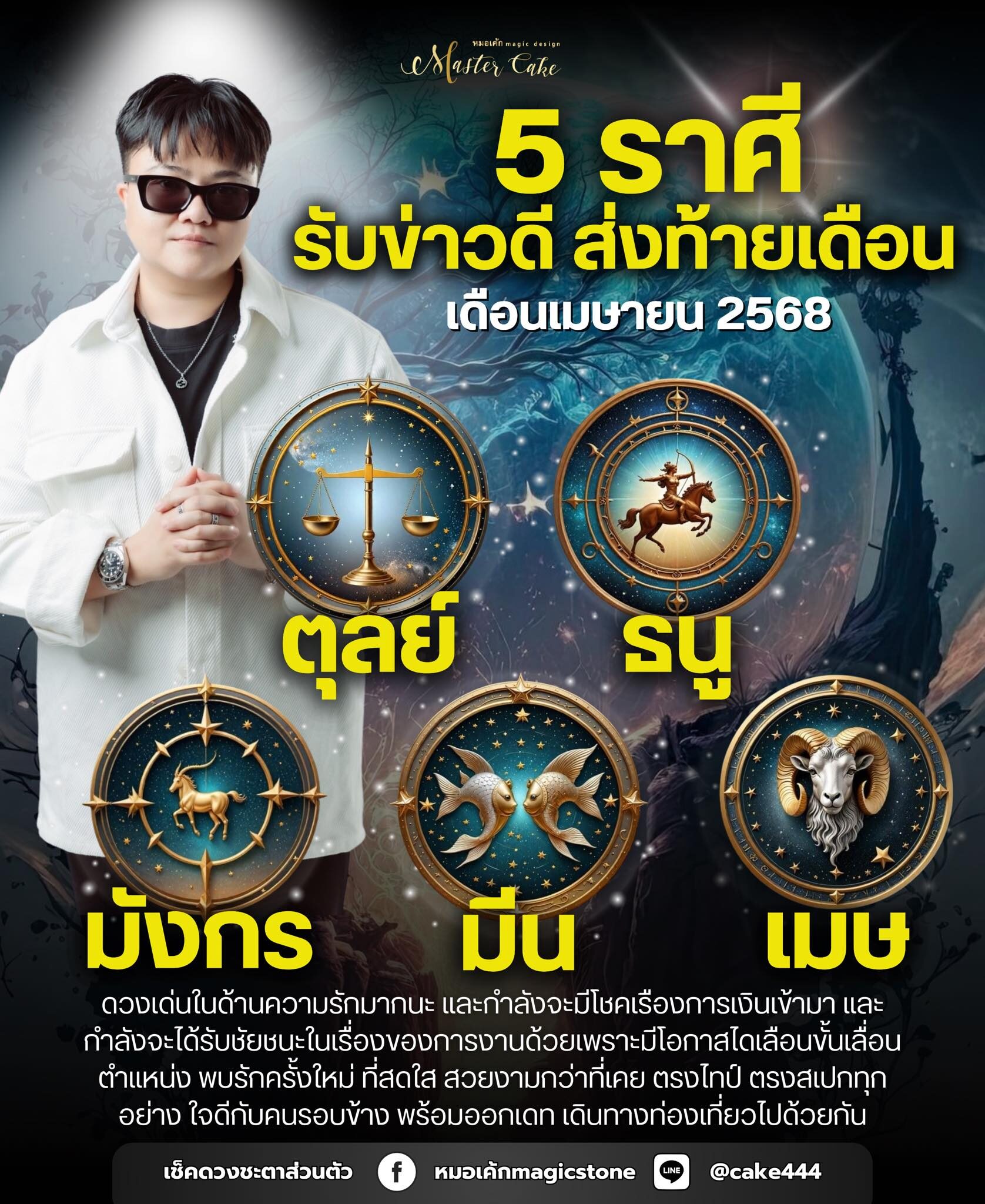 หมอเค้กMagic stone เผยถึงดวงชะตาราศี รับข่าวดีส่งท้ายเดือนเม.ย.2568 ดวงเด่นด้านความรัก และกำลังจะมีโชคเรื่องการเงินเข้ามา และกำลังจะได้รับชัยชนะในเรื่องของการงานด้วย เพราะมีโอกาสได้เลื่อนขั้นเลื่อนตำแหน่ง พบรักครั้งใหม่ สวยงามกว่าที่เคย ตรงสเปกทุกอย่าง ใจดีกับคนรอบข้าง