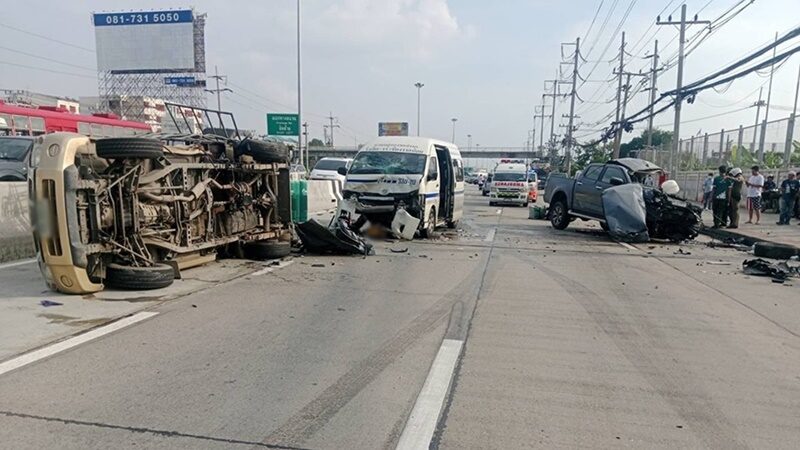 ตำรวจแนะเลี่ยงเส้นทางชั่วคราว อุบัติเหตุหมู่ รถกระบะ 2 คันชนกันยับ เฉี่ยวรถตู้โดยสารอีกคัน เจ็บ 18 รถขวางช่องทางคู่ขนาน ถนนพหลโยธินขาออก หน้าโชว์รูมโตโยต้านวนคร