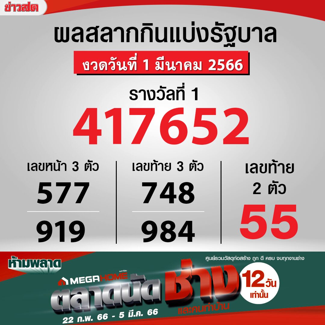งวดวันที่ 1 มี.ค.2566 เลขที่ออกได้แก่ 55