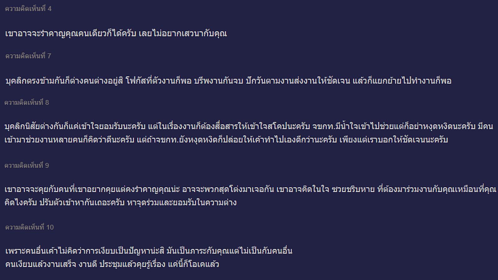 ตอนนั้นตนได้แต่บ่นในใจว่า คนเราจะไม่สนใจโลกขนาดนั้นเลยหรือ การที่ทำตัวแบบอยากคุยแค่กับคนนั้นคนนี้แล้วต้องมาทำงานร่วมกับผู้อื่น มันดูขัดแย้งยังไงชอบกล ทำไมคนแบบนี้ถึงไม่ไปทำงานฟรีแลนซ์ นั่งทำงานเงียบ ๆ คนเดียวไปเลย