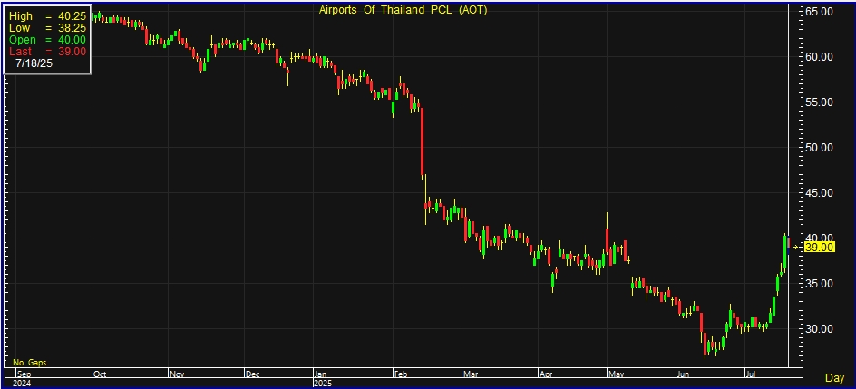 ทั้งนี้ ราคาหุ้น AOT ปรับตัวลดลงวันนี้คาดการณ์ว่านักลงทุนทยอยขายทำกำไรหลังราคาหุ้นเข้าเขตซื้อมากเกินไป โดยก่อนหน้านี้ราคาหุ้นปรับตัวเพิ่มขึ้นมา 6 วันทำการ คิดเป็นการปรับตัวขึ้นมา 10 บาท หรือ 33% เมื่อเทียบกับราคาปิดเมื่อวันที่ 8 ก.ค.68 ที่ระดับ 30.25 บาท