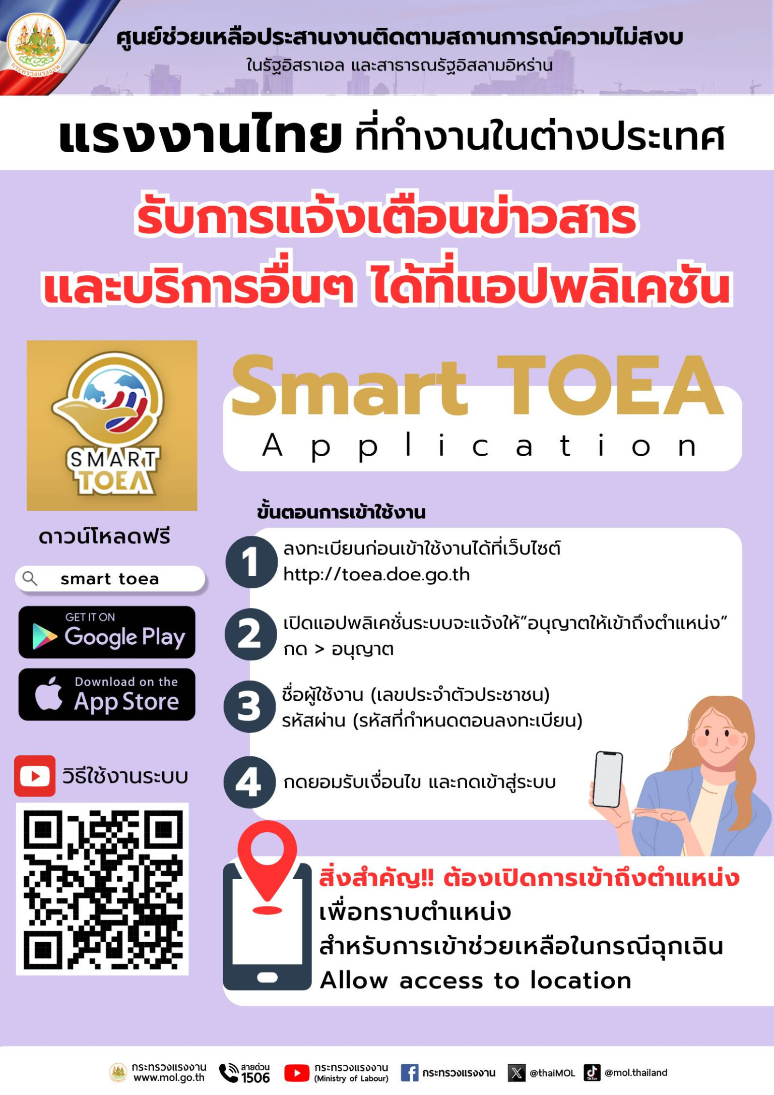 ก.แรงงานเปิดศูนย์ช่วยแรงงานไทยในอิสราเอล–อิหร่าน แนะโหลดแอป SMART TOEA เปิดแชร์โลเคชัน 24 ชม.