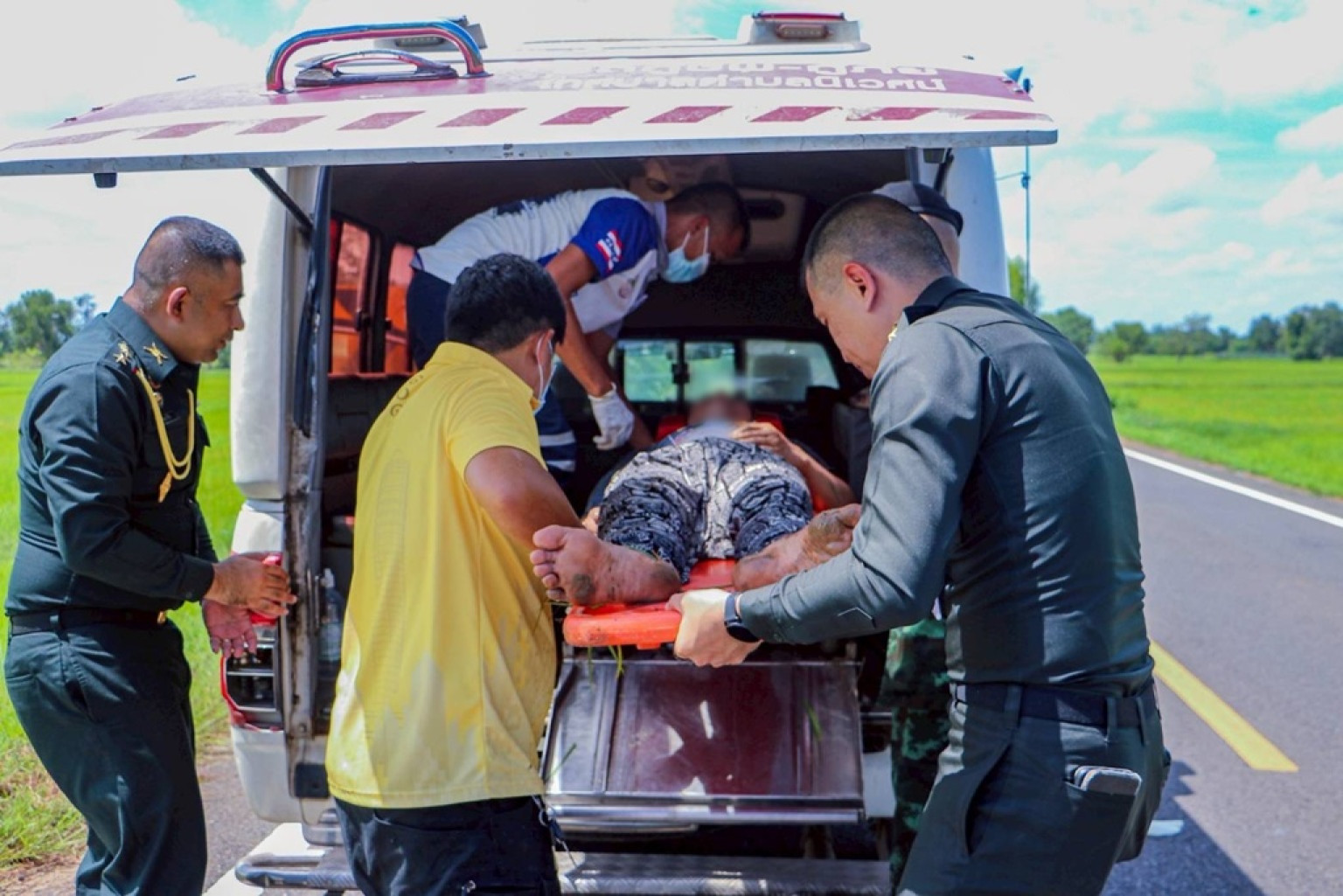 โดยพบว่ามีผู้บาดเจ็บเป็นผู้ชาย 1 ราย ทราบชื่อ นายศรัณยู (ขอสงวนนามสกุล) อายุ 32 ปี อยู่หมู่ 15 ตำบลนิเวศน์ อำเภอธวัชบุรี จังหวัดร้อยเอ็ด มีอาการบาดเจ็บบริเวณต้นคอและหัวไหล่ขวา และมีบาดแผลบริเวณขาซ้าย จึงได้โทรเเจ้ง 1669 มายังที่เกิดเหตุเพื่อทำการช่วยเหลือต่อไป