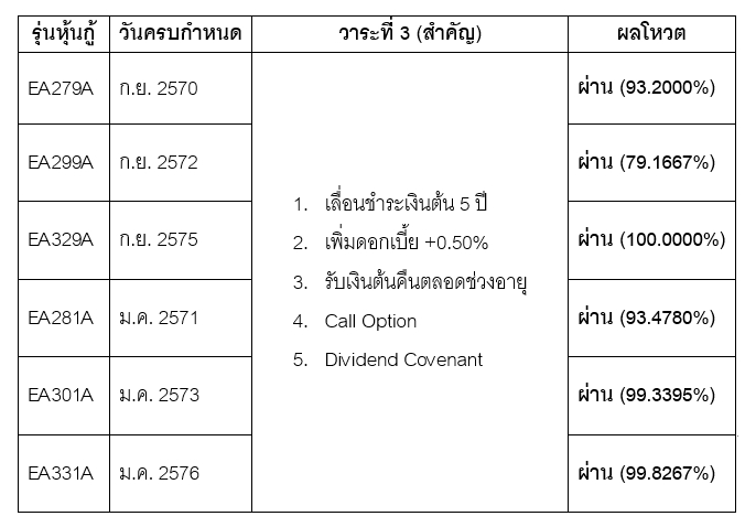 สำหรับหุ้นกู้ทั้ง 9 รุ่นที่ได้รับการอนุมัติในวันนี้ ประกอบด้วย 6 รุ่นใหม่ที่ได้รับเสียงสนับสนุนในที่ประชุมวันที่ 9 กรกฎาคม และ อีก 3 รุ่นที่ได้รับอนุมัติไปแล้วในการประชุมรอบก่อนเมื่อวันที่ 27 มิถุนายนที่ผ่านมา โดยทั้ง 9 รุ่นนี้ ต่างได้รับข้อเสนอฉบับปรับปรุง ซึ่งกำหนดให้มีการขยายระยะเวลาไถ่ถอนออกไปเพียง 5 ปี เท่ากันทั้งหมด เพื่อให้เกิดความชัดเจนและเป็นธรรมระหว่างทุกรุ่น ทั้งนี้มีเพียงรุ่น EA257A ที่ยังคงพิจารณารับข้อเสนอเดิมโดยยังคงขอขยายระยะเวลาไถ่ถอนออกไป 7 ปี ซึ่งแตกต่างจากข้อเสนอใหม่ที่ได้รับการเห็นชอบจากผู้ถือหุ้นกู้ส่วนใหญ่ในวันนี้