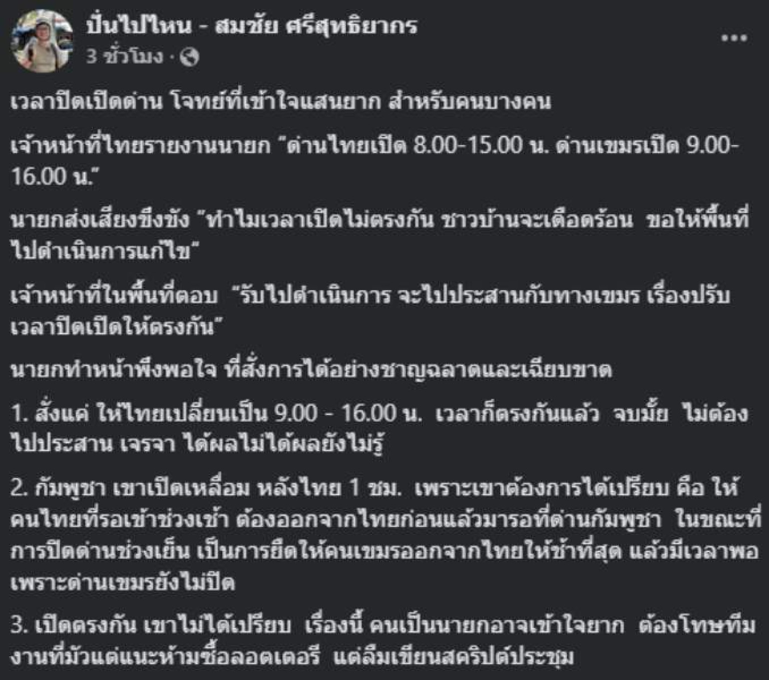 เจ้าหน้าที่ไทยรายงานนายก “ด่านไทยเปิด 8.00-15.00 น. ด่านเขมรเปิด 9.00-16.00 น.”