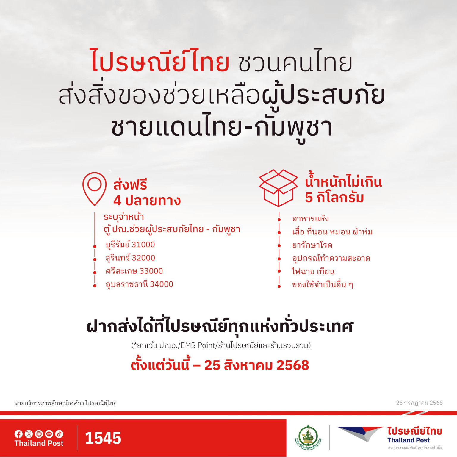 ไปรษณีย์ไทย เปิดช่องทางรับบริจาคสิ่งของผ่าน “ตู้ ปณ. ช่วยผู้ประสบภัยไทย – กัมพูชา” เพื่อเป็นศูนย์กลางในการส่งความช่วยเหลือ และกำลังใจจากประชาชนทั่วประเทศ ไปยังผู้ประสบภัยและเจ้าหน้าที่ทหารที่ปฏิบัติหน้าที่ในพื้นที่ชายแดนไทย–กัมพูชา โดยสามารถส่งสิ่งของจำเป็นไม่เสียค่าใช้จ่าย ตั้งแต่วันนี้ ถึง วันที่ 25 สิงหาคม 2568