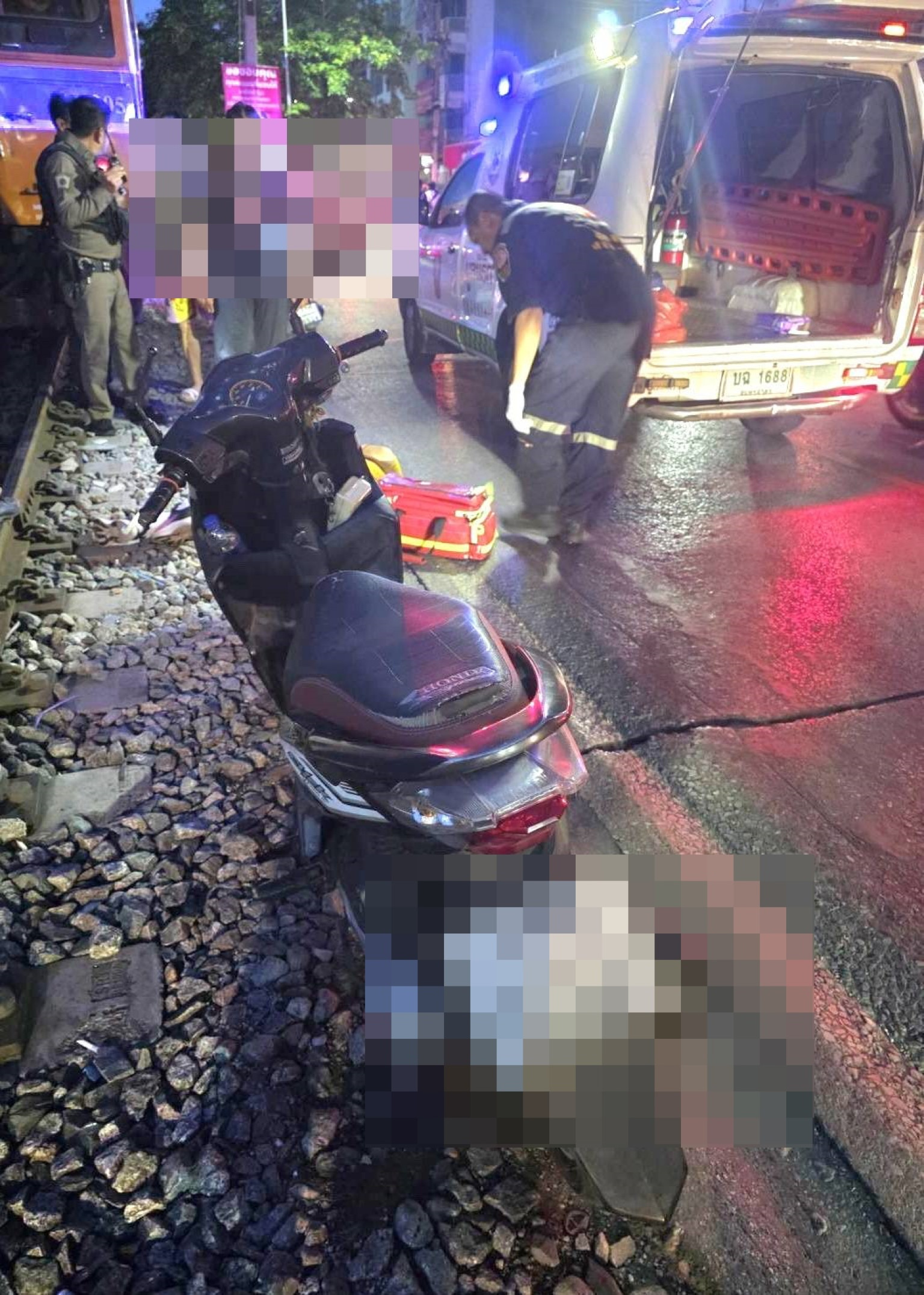 เมื่อไปถึงที่เกิดเหตุใกล้กับบริเวณแลนด์มาร์คมหาชัยพบ รถจักรยานยนต์ ฮอนด้า หมายเลขทะเบียน 1กท 3507 สมุทรสาคร ล้มอยู่บริเวณที่เกิดเหตุ มีผู้บาดเจ็บเป็นชายทราบชื่อต่อมาคือนายสงกรานต์นอนเจ็บอยู่ริมทางรถไฟมีแผลฉกรรจ์บริเวณหัวเลือดไหลเเดงเทั่วหัวและลำตัว เจ้าหน้าที่กู้ชีพจากมูลนิธิและพลเมืองดีช่วยกันปฐมพยาบาลและนำส่งโรงพยาบาลใกล้เคียง