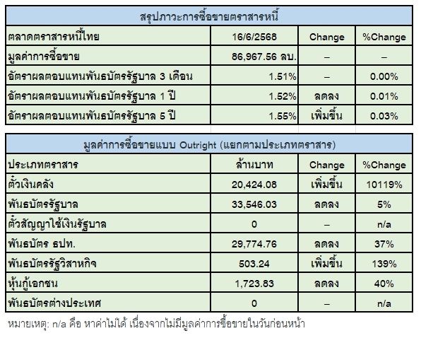 อัพเดต 16 มิ.ย. 2568 เวลา 10.35 น. • เผยแพร่ 16 มิ.ย. 2568 เวลา 10.35 น. • ข่าวหุ้นธุรกิจออนไลน์สมาคมตลาดตราสารหนี้ไทย (ThaiBMA) สรุปภาวะตลาดตราสารหนี้ไทยประจำวันนี้ (16 มิ.ย.68) มีมูลค่าการซื้อขายรวมทั้งวันอยู่ที่ 86,968 ล้านบาท ด้านประเภทของนักลงทุน ที่มีมูลค่าการซื้อขายสูงที่สุด 2 อันดับแรก คือ 1. กลุ่มบริษัทหลักทรัพย์จัดการกองทุน (บลจ.) ซื้อสุทธิ 14,455 ล้านบาท 2. กลุ่มบริษัทประกัน ซื้อสุทธิ 3,313 ล้านบาท ในขณะที่นักลงทุนต่างชาติ ขายสุทธิ 679 ล้านบาท ด้าน Yield พันธบัตรอายุ 5 ปี ปิดที่ 1.55% ปรับตัวเพิ่มขึ้นจากเมื่อวาน +0.03%