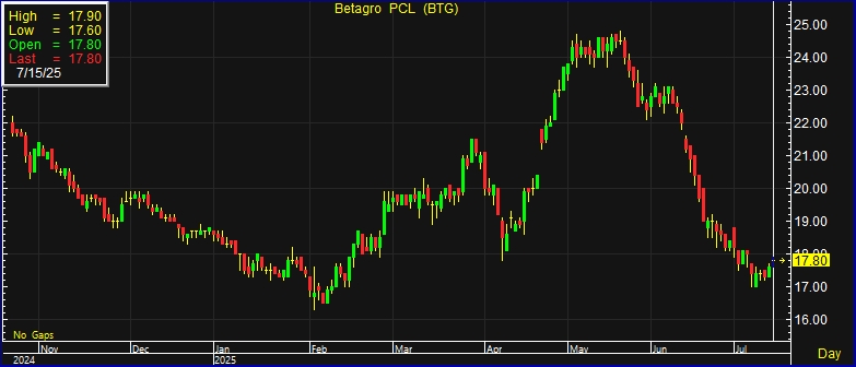 อัพเดต 15 ก.ค. 2568 เวลา 04.20 น. • เผยแพร่ 15 ก.ค. 2568 เวลา 04.20 น. • ข่าวหุ้นธุรกิจออนไลน์ผู้สื่อข่าวรายงานว่า วันนี้ (15 ก.ค.68) ราคาหุ้น ณ เวลา 11:07 น. บริษัท เบทาโกร จำกัด (มหาชน) หรือ BTG อยู่ที่ระดับ 17.80 บาท บวก 0.20 บาท หรือ 1.14% สูงสุดที่ระดับ 17.90 บาท ต่ำสุดที่ระดับ 17.60 บาท ด้วยมูลค่าการซื้อขาย 25.16ล้านบาท