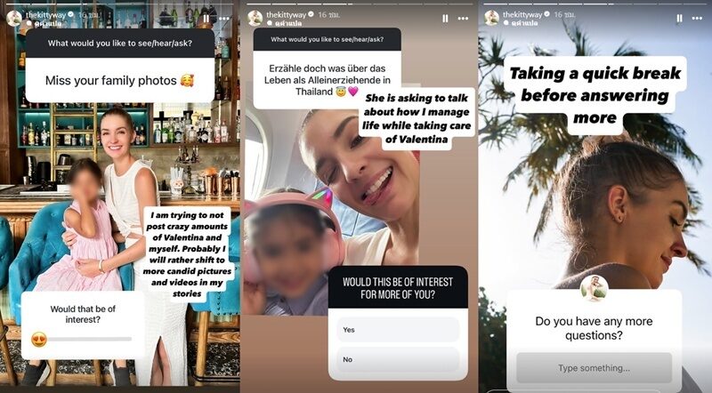 โดยตอนนี้ คิตตี้ บอกว่า “นอกจากงานแล้ว สิ่งที่ฉันให้ความสำคัญหลักๆ ก็คือการดูแลวาเลนติน่า เข้าโรงเรียนอนุบาล เล่นกีฬา ฯลฯ ขณะเดียวกันก็พยายามรักษาสุขภาพจิตและสุขภาพกายของตัวเองด้วย ” โดยมีแฟนๆเข้ามาส่งกำลังใจให้เข้มแข็งด้วย