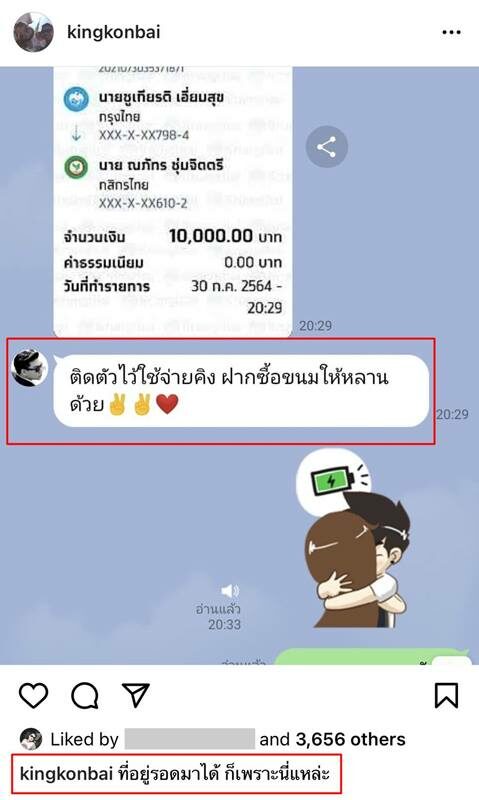 โอนเงินไปให้ส่วนตัวแบบนี้บ่อยไหม? “ถ้าสั่งของพี่จะสั่งเยอะ คือเราไม่กล้าโอนให้น้องมันโดยที่ไม่มีเหตุผล อยู่ๆ ไปโอนให้มันก็ต้องถามว่าพี่โอนให้ผมทำไม เราก็ไม่ทำแบบนั้น เราก็จะซื้อสั่งของมาเยอะๆ จะบอกกับพี่ตั๊กตลอดว่าเดี๋ยวช่วยคิงซื้อของ พี่ตั๊กเขาไม่เคยปฏิเสธเรื่องทำบุญเรื่องอะไรพวกนี้”