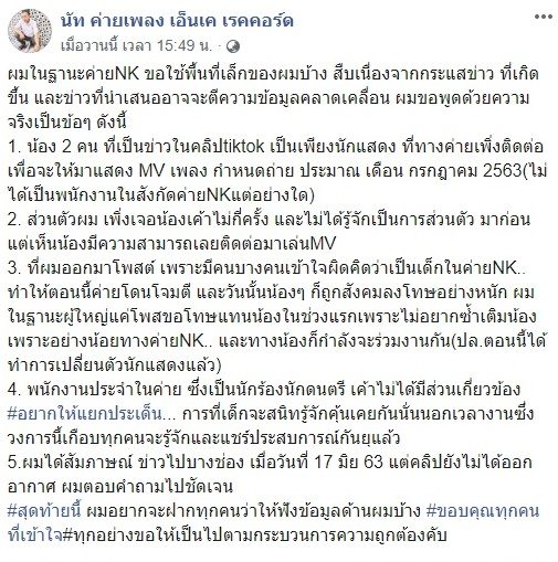 “ผมในฐานะค่ายNK ขอใช้พื้นที่เล็กของผมบ้าง สืบเนื่องจากกระแสข่าว ที่เกิดขึ้น และข่าวที่นำเสนออาจจะตีความข้อมูลคลาดเคลื่อน ผมขอพูดด้วยความจริงเป็นข้อๆ ดังนี้