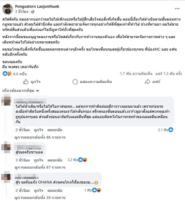 ผมขอโทษกับสิ่งที่เกิดขึ้นและผลกระทบต่างๆอีกครั้ง ขอโทษเพื่อนๆและผู้เกี่ยวข้องทุกคน พี่น้องMC และ แฟนคลับอีกครั้งครับ