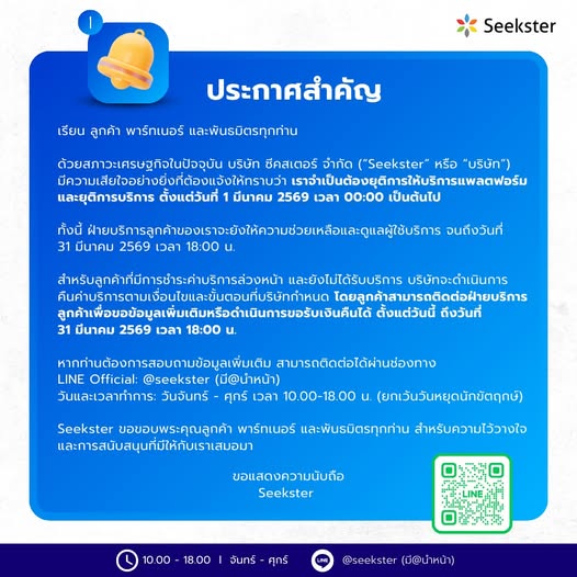 ข้อความระบุว่า “เรียน ลูกค้า พาร์ทเนอร์ และพันธมิตรทุกท่าน ด้วยสภาวะเศรษฐกิจในปัจจุบัน ประกอบกับการแข่งขันที่รุนแรงในตลาดธุรกิจการให้บริการออนไลน์ Seekster มีความเสียใจอย่างยิ่งที่ต้องแจ้งให้ทราบว่า เราจำเป็นต้องยุติการให้บริการแพลตฟอร์ม และยุติการรับคำสั่งซื้อบริการ ตั้งแต่วันที่ 1 มีนาคม 2569 เวลา 00:00 น. เป็นต้นไป