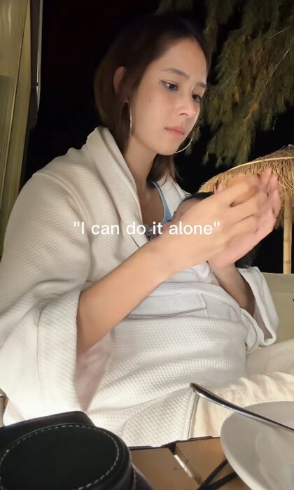ขณะที่ย้อนโพสต์ของ ใบหม่อน เคยโพสต์ลงติ๊กต็อกขณะอุ้มลูก ข้อความภาษาอังกฤษลักษณะตัดพ้อหรือไม่หรืออย่างไรว่า “I can do it alone” เมื่อปลายเดือนที่แล้ว พร้อมแคปชั่นว่า