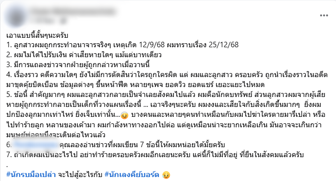 3.มีการแถลงข่าวจากฝ่ายผู้ถูกกล่าวหาเมื่อวานนี้ 4.เรื่องราวคดีความใดๆ ยังไม่มีการตัดสินว่าใครถูกใครผิด แต่ผมและลูกสาว ครอบครัว ถูกนำเรื่องราวในอดีตมาขุดคุ้ยบิดเบือน ข้อมูลต่างๆ ขึ้นหน้าฟีด หลายเพจ ยอดวิว ยอดแชร์ เยอะแยะไปหมด