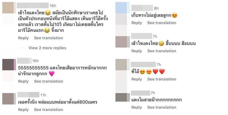 ไม่ว่าจะเป็น แตงไทยเสียทรงเลยลูกกกก, เข้าใจแตงไทยเลยค่า นี่ยังเขินแทนน้องเลย, เข้าใจแตงไทยเลย พี่ก็เป็น ฮึบไม่อยู่, มีคนเลิกลั่กจ้า แม่แจง น่าเอ็นดู, สมัยเป็นนักศึกษาเราเคยไปเป็นตัวประกอบหนังที่มาริโอ้แสดง เห็นมาริโอ้ครั้งแรกแล้ว เราสตั๊นไป10 วิ เกิดมาไม่เคยสตั๊นใคร มาริโอ้คนแรก จึ้งมาก, เจอครั้งนึง หล่อแบบหล่อมาตั้งแต่ 800 เมตร ฯลฯ