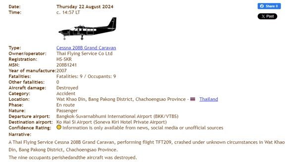 วันที่ 23 ส.ค.2567 ผู้สื่อข่าวรายงานว่า จากกรณีเกิดเหตุ เครื่องบินเล็ก เที่ยวบินที่ TFT209 แบบเครื่อง Cessna caravan C208 ทะเบียน HSSKR เป็นของบริษัท ไทย ฟลายอิ้ง เซอร์วิส จำกัด ตกลงบริเวณป่าชายเลนหลังวัดเขาดิน ม.6 ต.เขาดิน อ.บางปะกง จ.ฉะเชิงเทรา เป็นเหตุให้มีผู้เสียชีวิต 9 ราย เหตุเกิดเมื่อวันที่ 22 ส.ค.ที่ผ่านมา ตามที่เสนอข่าวไปแล้วนั้น