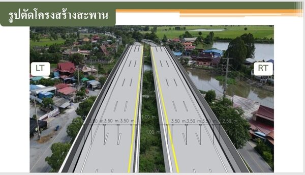 แบ่งทิศทางการจราจรด้วยเกาะกลางแบบกดเป็นร่อง (DEPRESSED MEDIAN) ผิวทางคอนกรีตหนา 35 เซนติเมตร ก่อสร้างสะพานคอนกรีตเสริมเหล็ก จำนวน 3 แห่ง ได้แก่