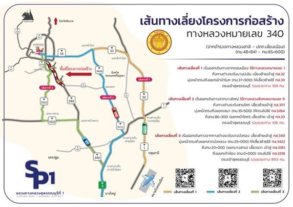 สำหรับเส้นทางเลี่ยงโครงการก่อสร้างทางหลวงหมายเลข 340 จากตำรวจทางหลวงสาลี-ปตท.เลี่ยงเมือง กม.48+841-กม.65+600 เส้นทางเลี่ยงที่ 1 เริ่มจากเดินทางจากดอนเมือง ใช้เส้นทางหลวงหมายเลข 1 ถึงทางต่างระดับบางปะอิน เบี่ยงซ้ายเข้าสู่ ทล.32 มุ่งหน้าตรงถึงแยกเข้า ป่าโมก (กม.37+900) ให้เลี้ยวซ้ายใช้ ทล.33 ตรงเข้าสุพรรณบุรี รวมระยะทาง 109 กิโลเมตร ทั้งนี้ จะเริ่มปิดถนนในวันที่ 10 ต.ค.2567 ถึงปี 2570