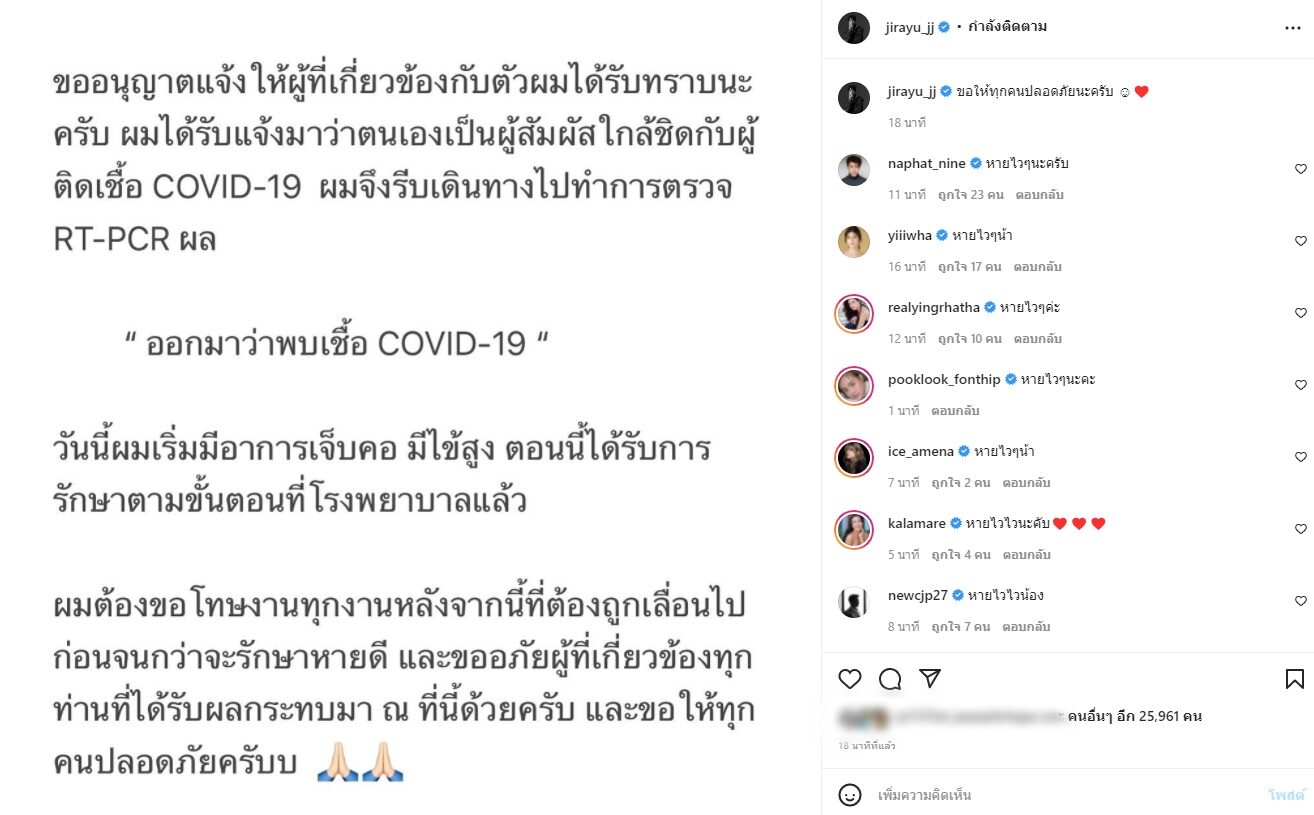โดยระบุว่า ขออนุญาตแจ้งให้ผู้เกี่ยวข้องกับตัวผมได้รับทราบนะครับ ผมได้รับแจ้งมาว่าตนเองเป็นผู้สัมผัสใกล้ชิดกับผู้ติดโควิด-19 ผมจึงเดินทางไปทำการตรวจอาร์ที-พีซีอาร์ ผลออกมาว่าพบติดโควิด-19