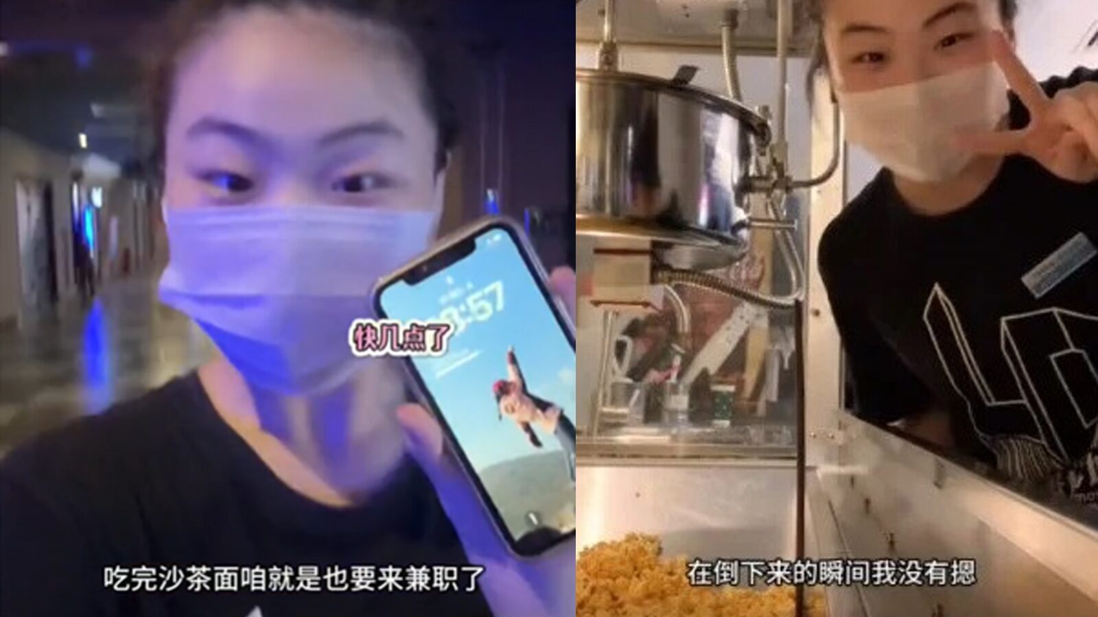 หลังจากทำงานที่ร้านอาหารครบ 12 ชั่วโมง เธอไปทำงานต่อที่โรงภาพยนตร์ ตักป๊อปคอร์นและดูแลความสะอาดเคาน์เตอร์จนถึง 23:00 น. จากนั้นยังต้องดูแลช่องโซเชียลของตัวเอง กว่าจะได้เข้านอนก็เป็นเวลาเที่ยงคืนครึ่ง