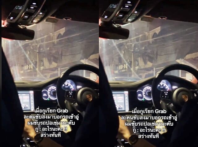 แล้วตนก็พิมพ์ไปบอกคนขับว่า "รออยู่หน้าตึกนะคะ" สักพักคนขับก็โทรมาแล้วบอกว่า "ผมถึงแล้วนะครับ ผมขับรถเก๋งสีดำจอดอยู่ข้างหน้า" ตอนแรกตนหารถ Grab ไม่เจอ จึงถามคนขับว่าเขาขับรถรุ่นอะไร คนขับก็ตอบกลับมาว่า "ผมขับ Porsche มาครับ" พอได้ยินแบบนั้นตนก็ถึงกับตกใจและถามกลับไปว่า "อะไรคะพี่ พูดอีกที"