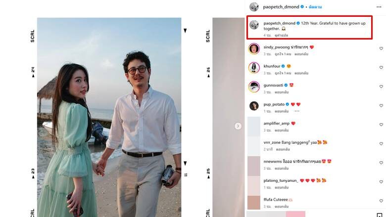 พร้อมกับแปะแคปชั่น “12th Year. Grateful to have grown up together.” แปลได้ว่า“ครบรอบ 12ปี ดีใจที่เติบโตมาด้วยกัน” ท่ามกลางเพื่อนในวงการและแฟนๆ ที่เข้ามาส่งอีโมจิรูปหน้ายิ้มหัวใจและชื่นชมความน่ารักของทั้งคู่ รวมถึงแชร์ให้แต่งงานได้แล้ว