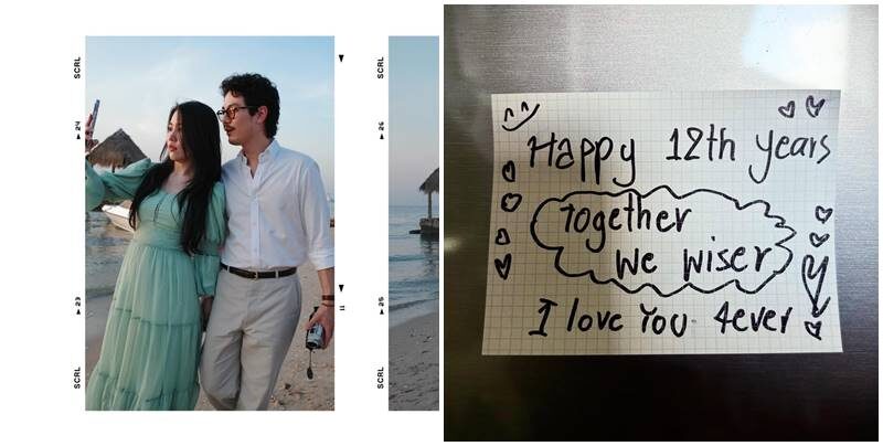 ล่าสุดหนุ่มเพชร แชร์รูปหวานคู่ สาวแปม ในวาระครบรอบ 12 ปี โดยเป็นภาพที่ทั้งสองคนเดินจับมือกันริมทะเล รวมถึงภาพข้อความที่เขียนด้วยลายมือว่า “Happy 12th Year. Together we wiser. I love you 4ever.