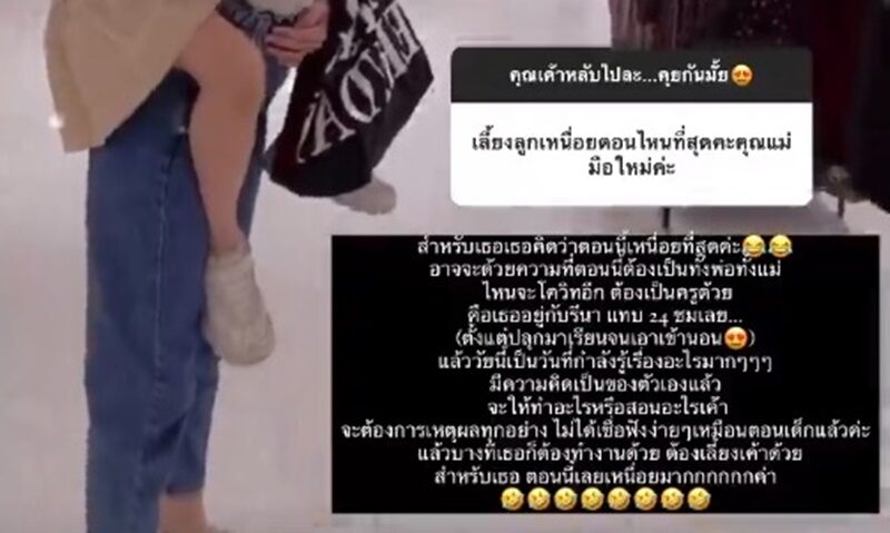 ขณะที่มีคนถามว่าเลี้ยงลูกเหนื่อยตอนไหนที่สุดคะคุณแม่มือใหม่ค่ะ เธอ ตอบว่า สำหรับเธอ เธอคิดว่าตอนนี้เหนื่อยที่สุดค่ะ อาจจะด้วยความที่ตอนนี้ต้องเป็นทั้งพ่อทั้งแม่ ไหนจะโควิดอีก ต้องเป็นครูด้วย คือเธออยู่กับรีนา แทบ24ชม.เลย ตั้งแต่ปลุกมาเรียนจนเอาเข้านอน แล้ววัยนี้กำลังเป็นวัยที่รู้เรื่องอะไรมากๆๆๆ มีความคิดเป็นของตัวเองแล้ว จะให้ทำอะไรหรือสอนอะไรเค้า จะต้องการเหตุผลทุกอย่าง ไม่ได้เชื่อฟังง่ายๆ เหมือนตอนเด็กแล้วค่ะ แล้วบางทีเธอก็ต้องทำงานด้วย ต้องเลี้ยงเค้าด้วย สำหรับเธอตอนนี้เลยเหนื่อยมากกกกกกค่า