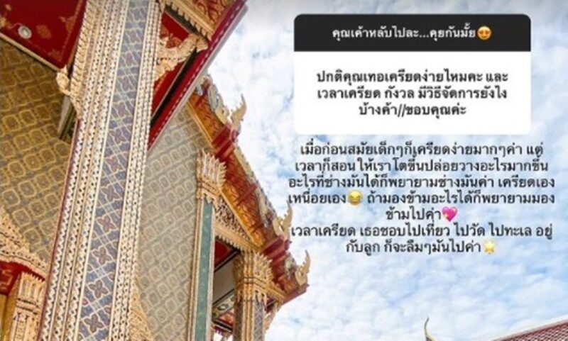 โดยมีคนถามด้วยว่า ปกติเครียดง่ายไหมคะ เวลาเครียดกังวลมีวิธีจัดการยังไงบ้าง เธอ ตอบว่า เมื่อก่อนสมัยเด็กๆก็เครียดง่ายมากๆค่า แต่เวลาก็สอนให้เรา โตขึ้นปล่อยวางอะไรมากขึ้น อะไรที่ช่างมันได้ก็พยายามช่างมันค่า เครียดเองเหนื่อยเอง ถ้ามองข้ามอะไรได้ก็พยายามมองข้ามไปค่า เวลาเครียดเธอชอบไปเที่ยว ไปวัดไปทะเลอยู่กับลูกก็จะลืมๆมันไปค่า